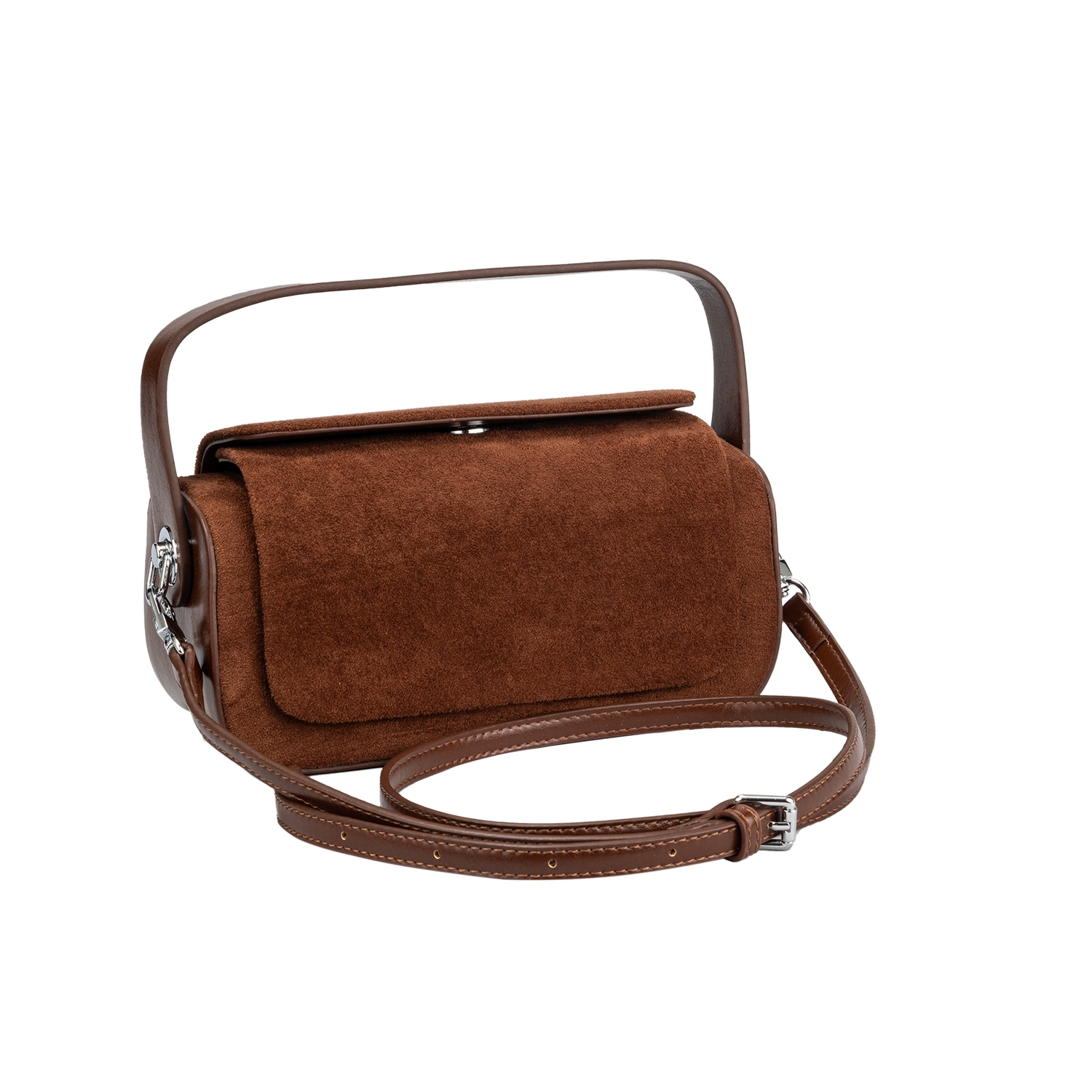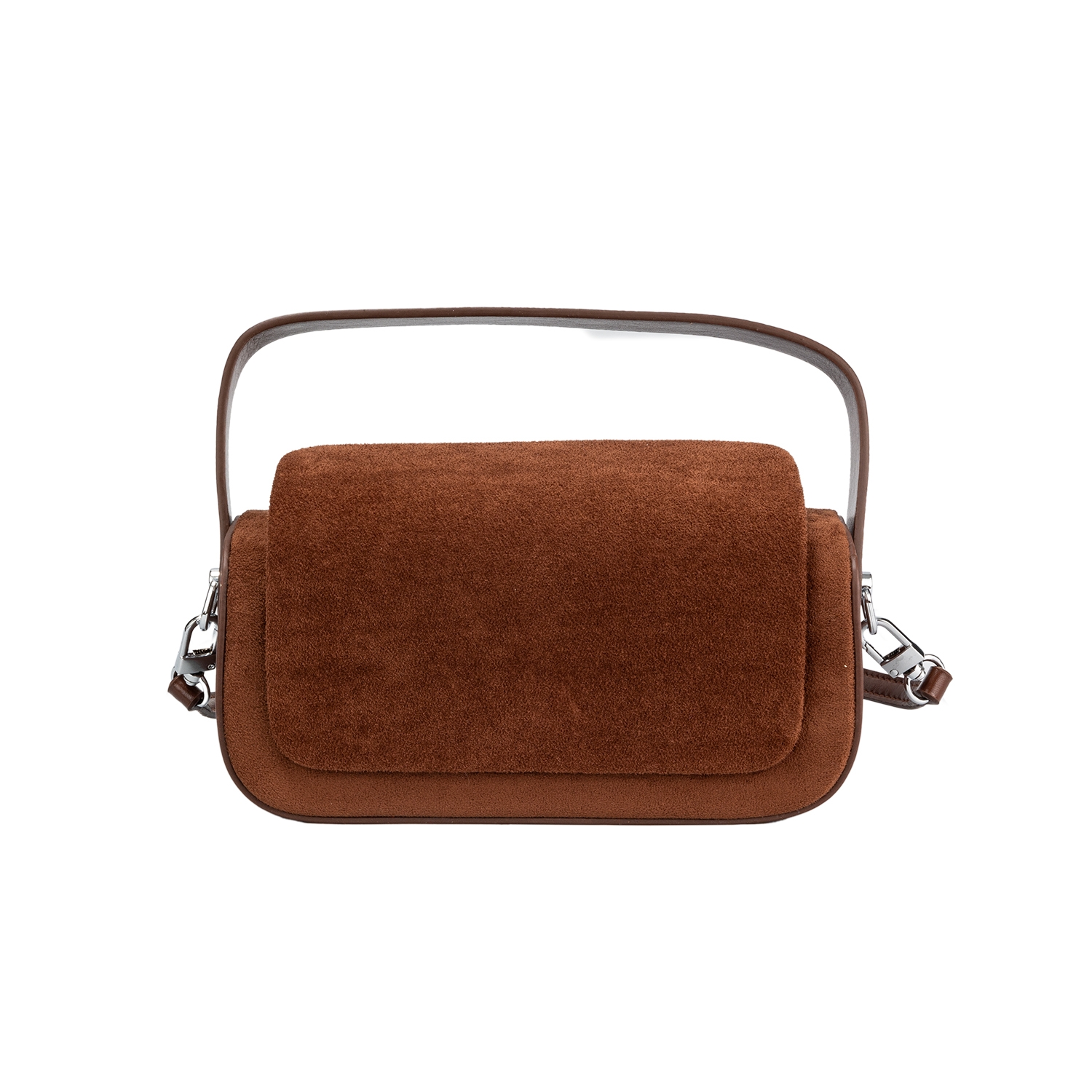 • Стилен дамски аксесоар за вашата модерна визия - велурена чанта с атрактивна форма и една дръжка за носене в ръка .